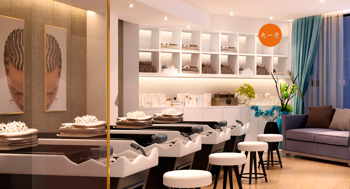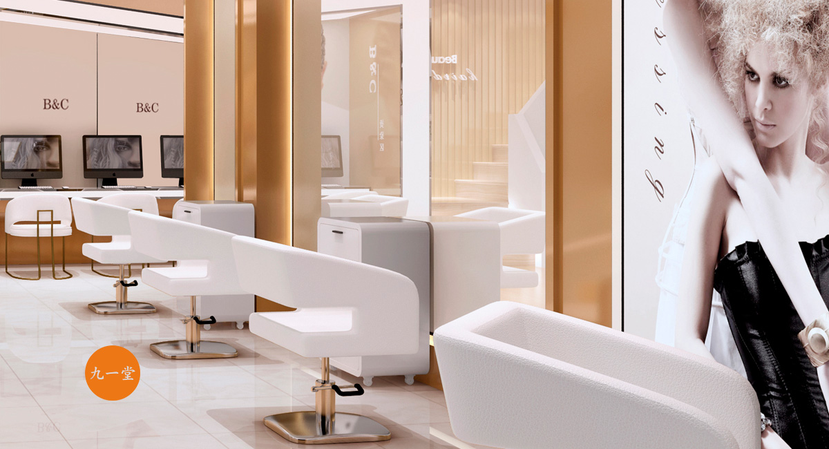 B&C美發沙龍主要客群集中在70,80后,多以女性主, 她們對環境和服務要求苛刻,他們也是有情懷的,他們喜歡浪漫、時尚、溫馨、高逼格的小資氛圍。B&C美發沙龍,在品牌個性上凸現尊貴與品質, 在色調搭配上運用玫瑰金以及象牙白的結合,多用石材與暖光作對比, 強調不同的品牌調性與體驗。